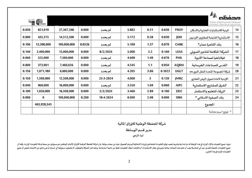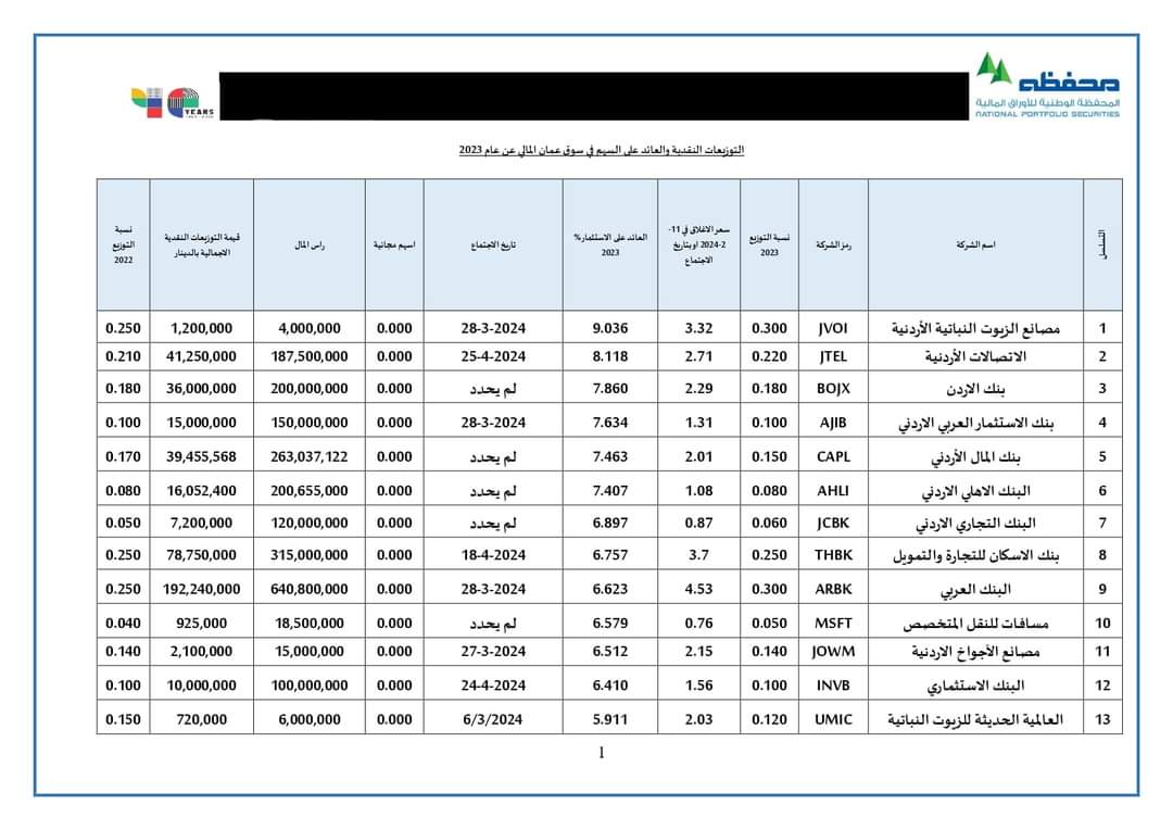 تالياً التوزيعات النقدية للشركات المساهمة العامة والعائد على السهم لعام 2023
