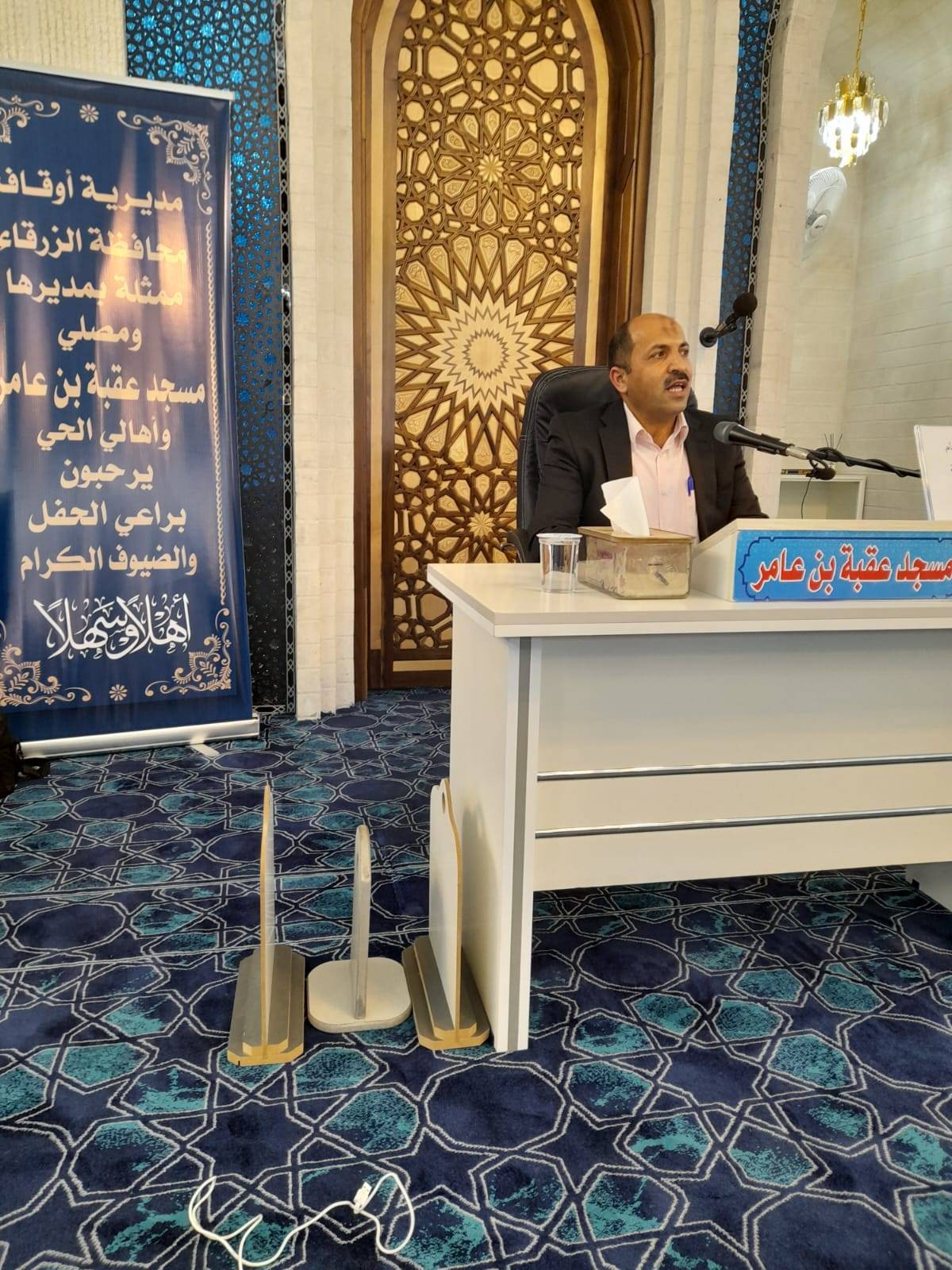 وليد حماد- رعى سماحة الدكتور احمد الحسنات مفتي عام المملكة الاحتفال الديني الذي أقامته مديرية أوقاف الزرقاء بمناسبة ذكرى الاسراء والمعراج الشريفين في مسجد عقبة بن عامر، بحضور مدير أوقاف الزرقاء الدكتور أحمد الحراحشة، مساعد محافظ الزرقاء سامي الشوابكة مندوباً عن عطوفة محافظ الزرقاء، الدكتور رائد الشوابكة نائب مدير أوقاف الزرقاء، رجائي المشاقبة امام مسجد عقبة بن عامر والدكتور أحمد الزعبي امام مسجد العرب.