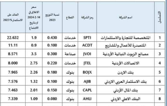 حسب النشرات المالية للشركات المدرجة في سوق عمان المالي، فقدد حققت 8 شركات عائدات على السهم فوق 7% حتى الان.