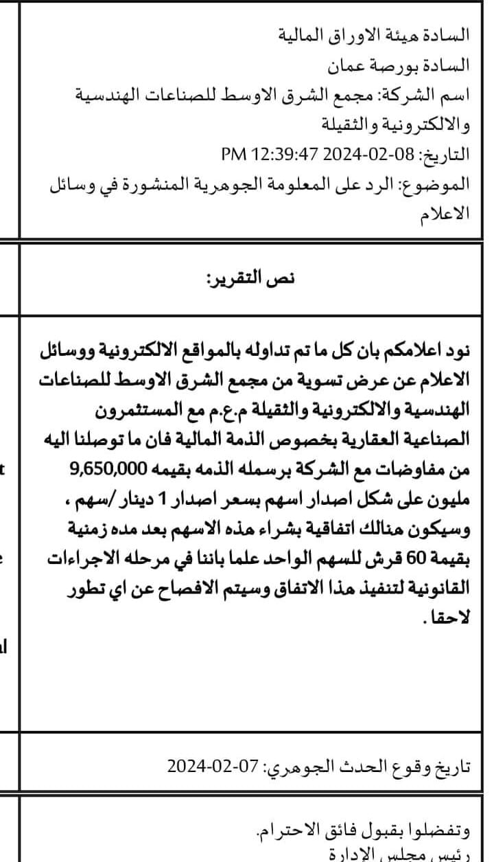 توضيح هام من شركة مجمع الشرق الأوسط حول "عرض التسوية"