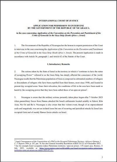 طلب من حكومة جمهورية نيكاراغوا الى محكمة العدل الدولية الإذن بالتدخل في القضية المتعلقة بتطبيق اتفاقية منع جريمة الإبادة الجماعية في قطاع غزة والمعاقبة عليها (جنوب أفريقيا ضد إسرائيل)