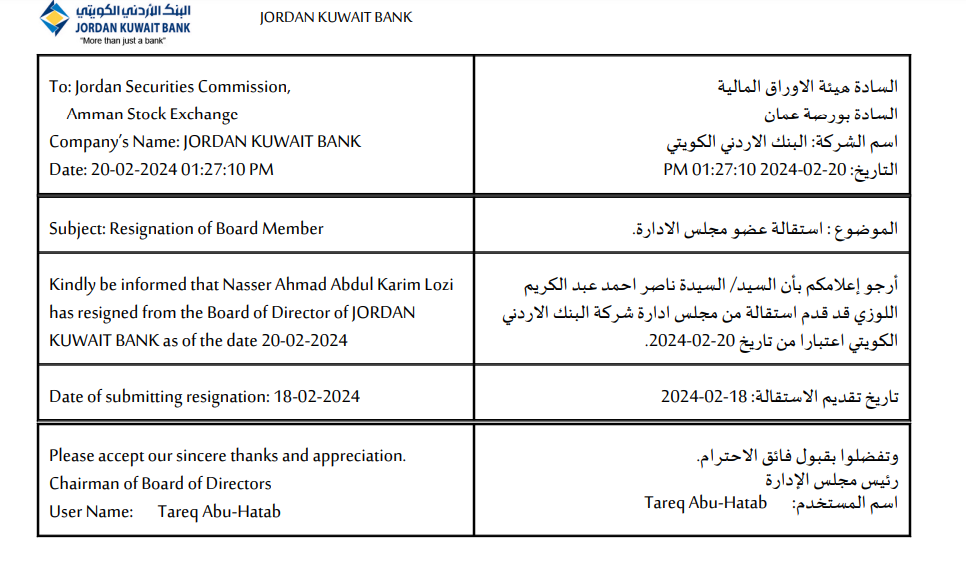 أعلن البنك الأردني الكويتي استقالة رئيس مجلس أدارة البنك ناصر اللوزي، من منصبه الذي يشغله منذ ايار (مايو) 2021.