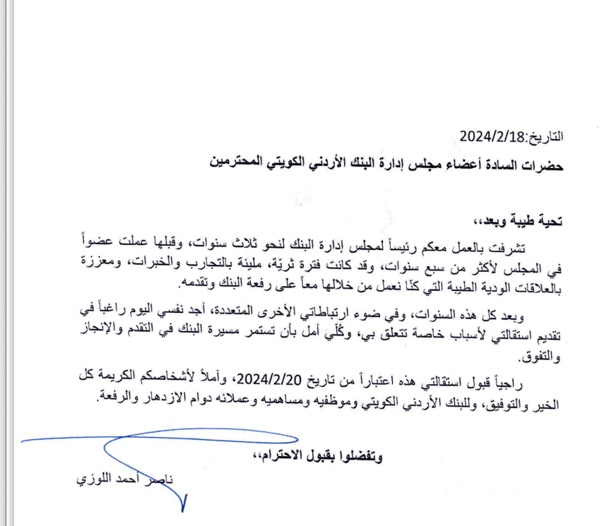 استقالة اللوزي من رئاسة مجلس ادارة البنك الأردني الكويتي