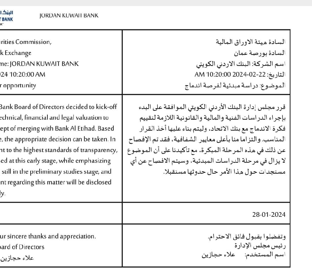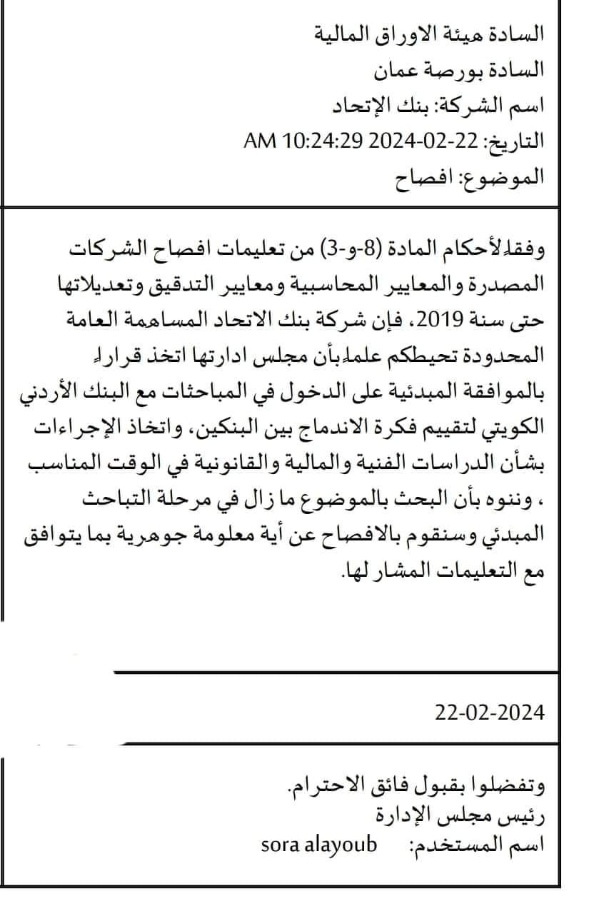 في إفصاحين منفصلين على موقع هيئة الأوراق المالية، أوضح كل من البنك الأردني الكويتي، وبنك الاتحاد، موقفهما من عملية الاندماج بين البنكين.
