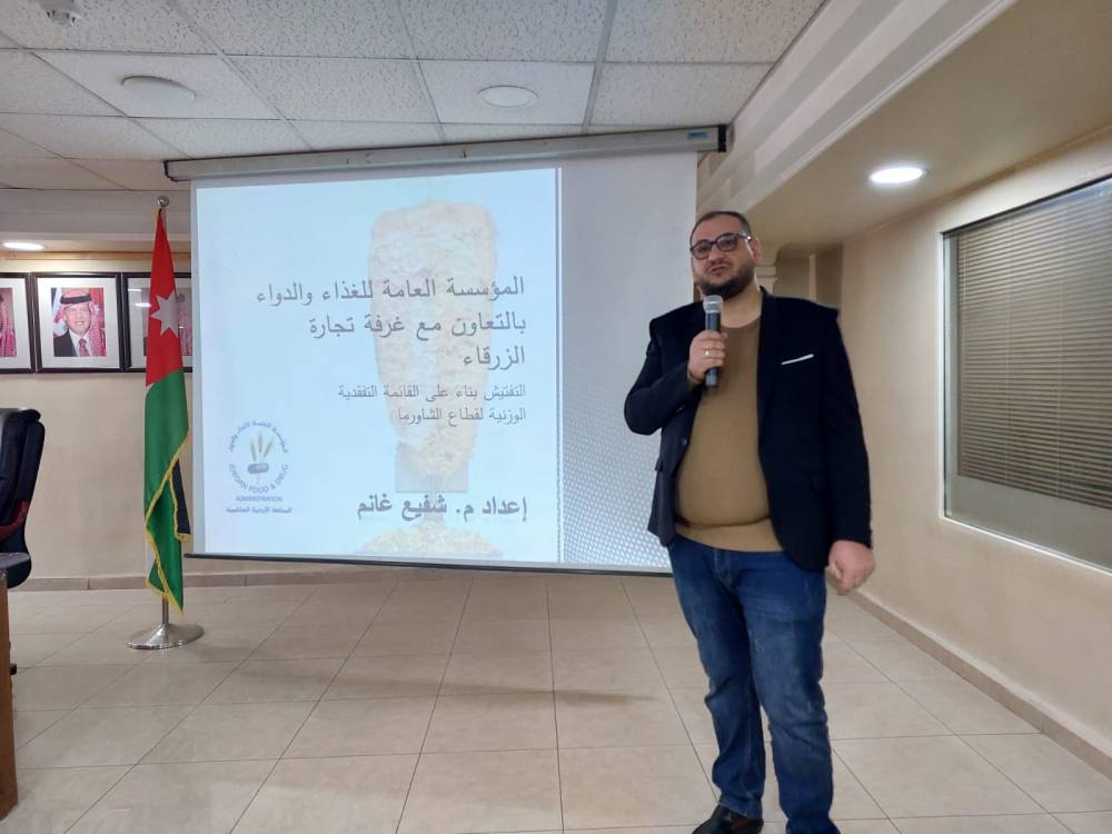 وافتتح الورشة حسين شريم رئيس غرفة تجارة الزرقاء، وقدمها أحمد العبهري مدير المؤسسة العامة للغذاء والدواء – فرع الزرقاء، والمهندس شفيع غانم من المؤسسة العامة للغذاء والدواء.