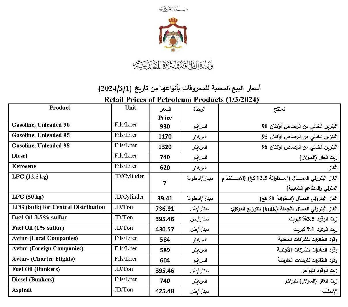 وعليه قررت لجنة تسعير المشتقات النفطية رفع سعر بيع البنزين أوكتان 90 ليصبح (930) فلساً/لتر بدلاً من (910) فلساً /لتر، ورفع سعر بيع البنزين أوكتان 95 ليصبح (1170) فلساً/لتر بدلاً من (1150) فلساً/لتر، ورفع سعر الديزل ليصبح (740) فلساً/لتر بدلاً من (720) فلساً/لتر.