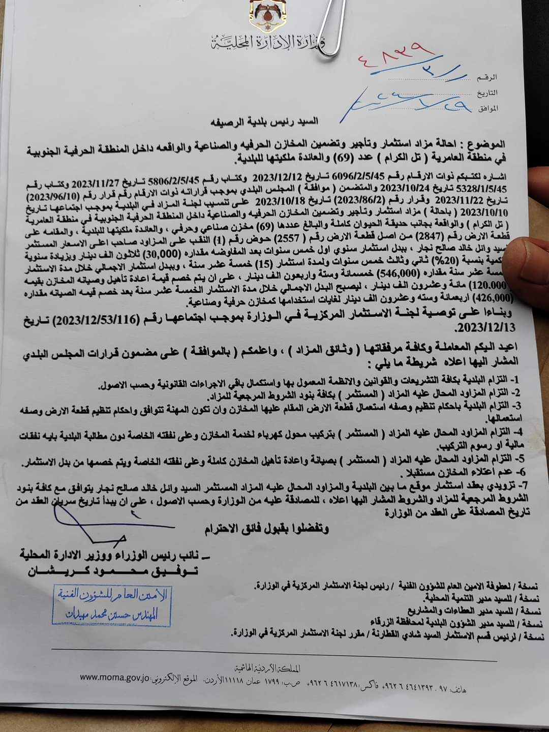 وذلك بعد أن مر العطاء بكافة مراحله القانونية وبعد موافقة لجنة الاستثمار في وزارة الادارة المحلية وموافقة معالي الوزير