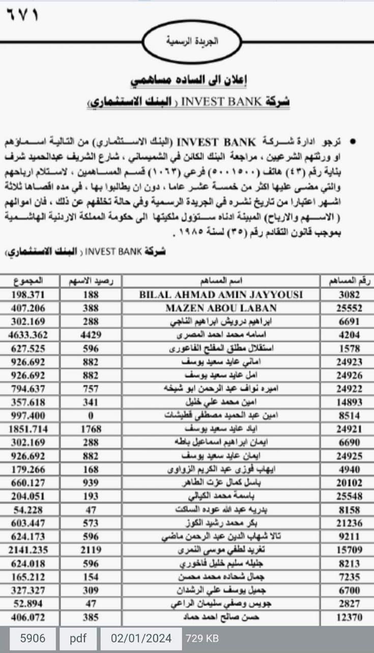 دعا البنك الاستثماري عشرات الأردنيين المساهمين في البنك لاستلام أرباحهم ومخصصاتهم المالية، محذراً بأن تلك الاموال ستؤول الى حكومة المملكة الأردنية الهاشمية في حال عدم حال عدم استلامهم لتلك الاموال وذلك خلال 3 أشهر من تاريخ هذا الإعلان الذي نشر في الجريدة الرسمية.