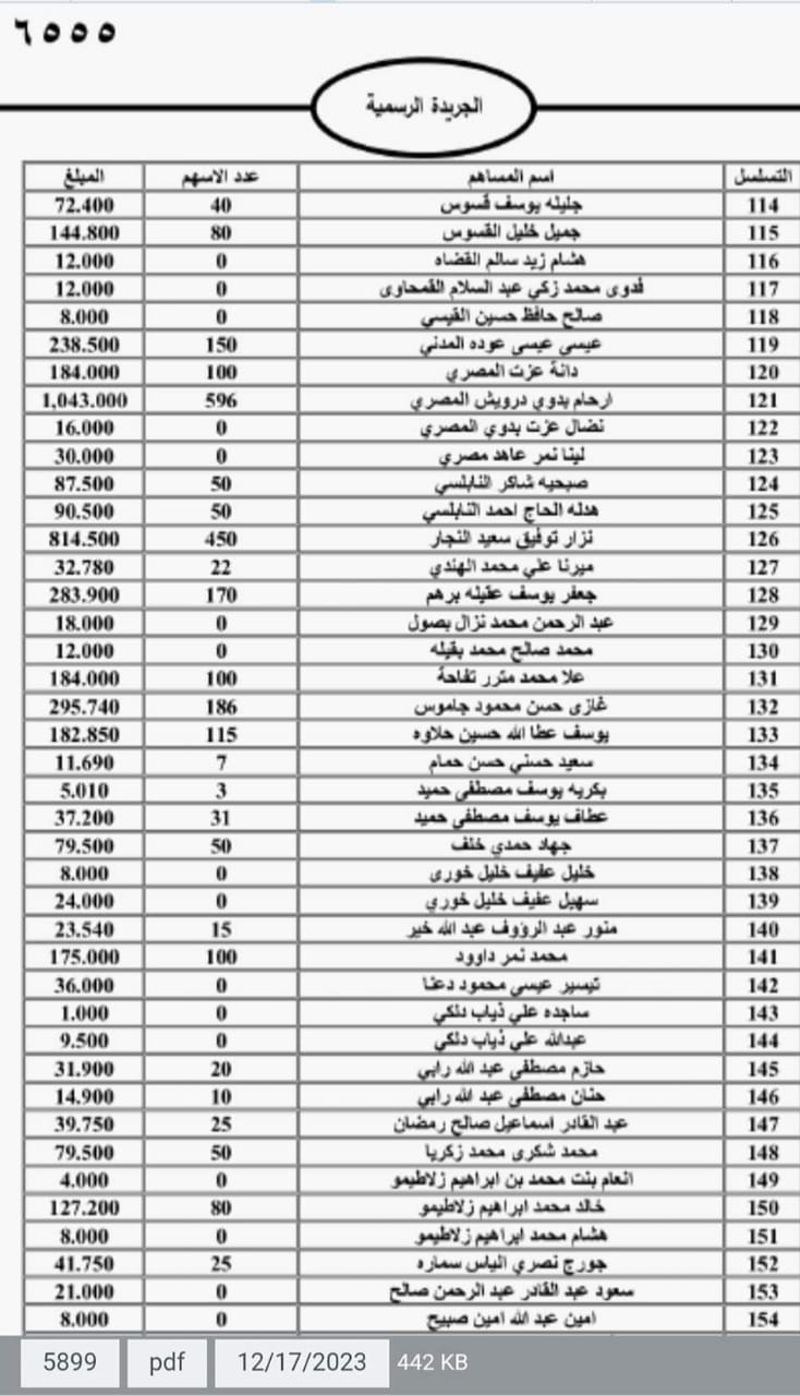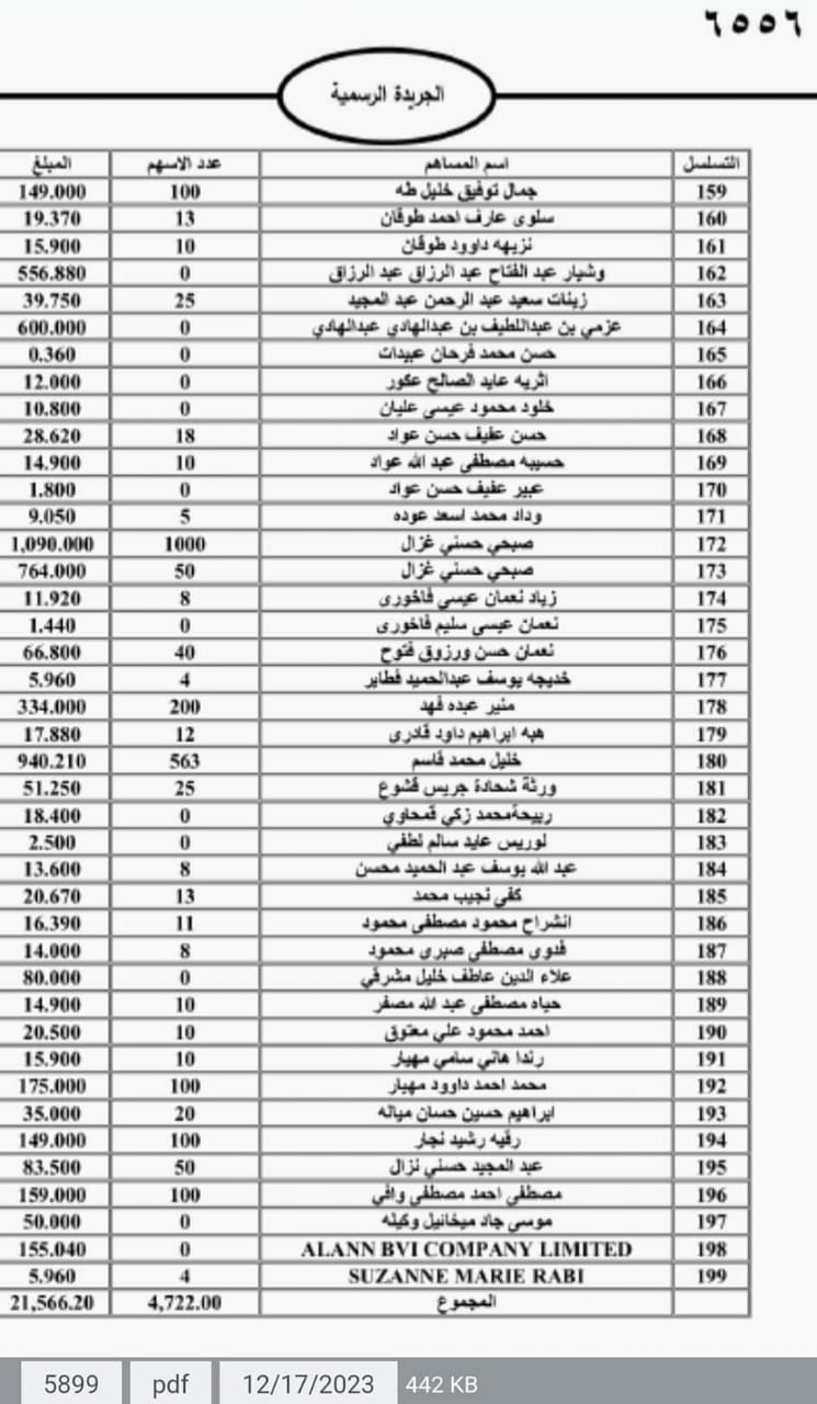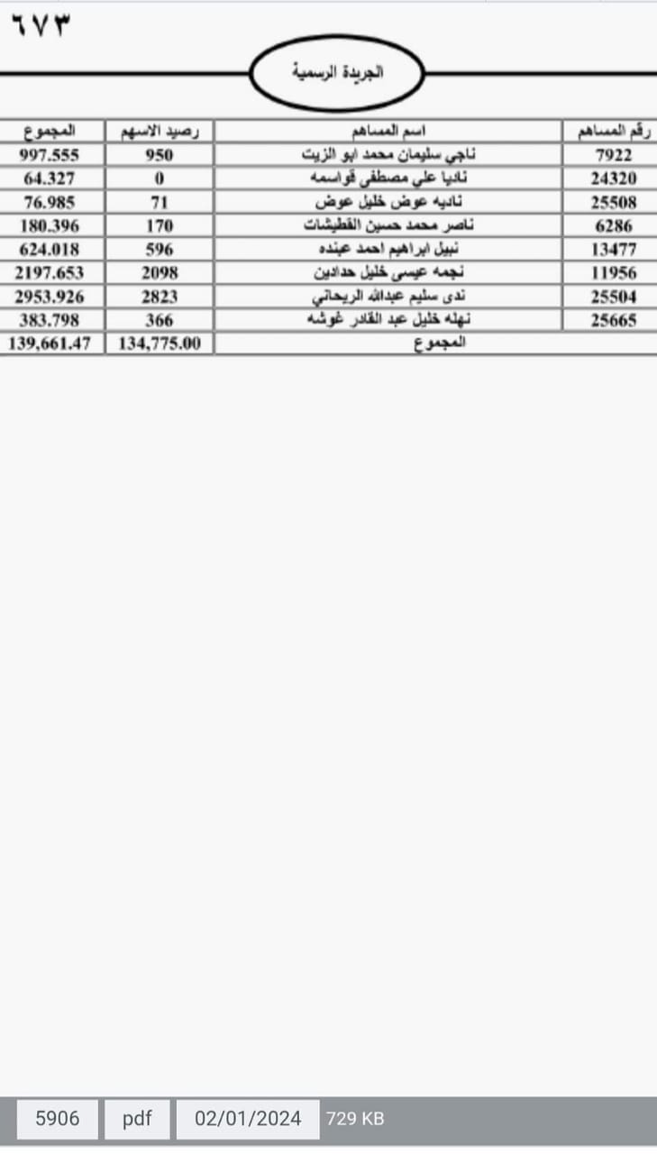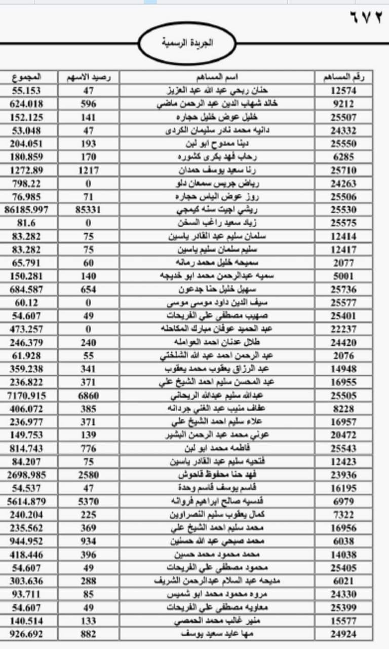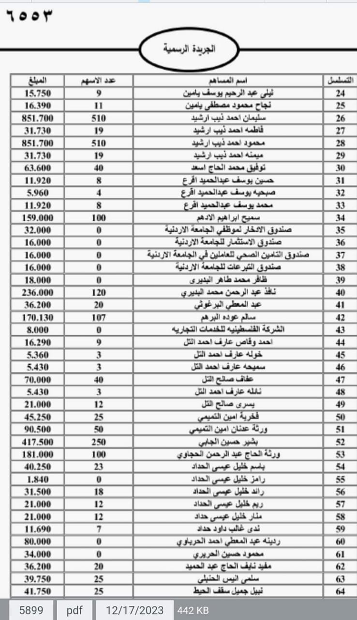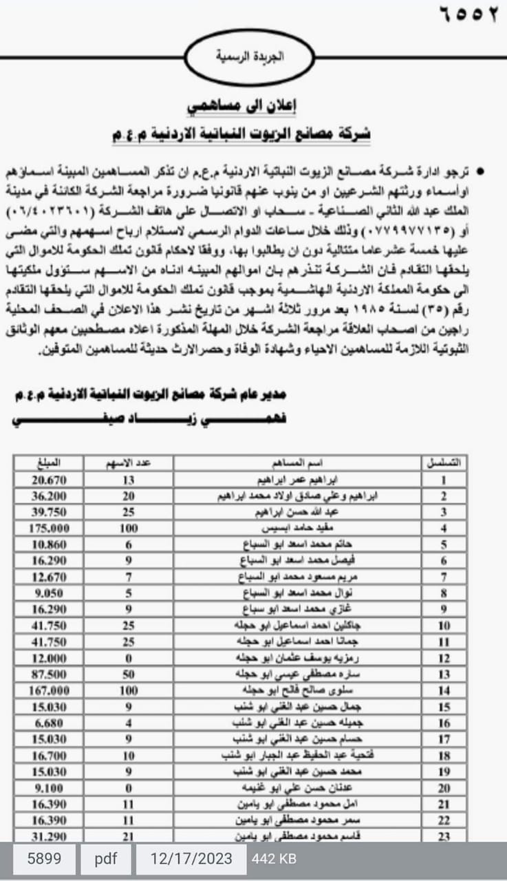كما دعت شركة مصانع الزيوت النباتية الأردنيين عشرات المواطنين أو ورثتهم من مساهميها ممن مضى على حقوقهم المالية 15 عاماً لمراجعتها واستلام مخصصاتهم خلال 3 أشهر من تاريخ نشر الإعلان في الجريدة الرسمية أو ستؤول للحكومة.