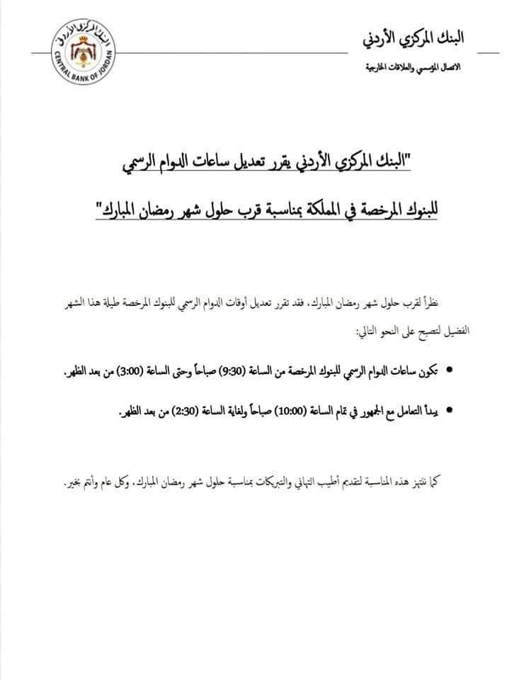 قرر البنك المركزي تعديل ساعات الدوام الرسمي للبنوك المرخصة في المملكة بمناسبة قرب حلول شهر رمضان المبارك، كما يلي :