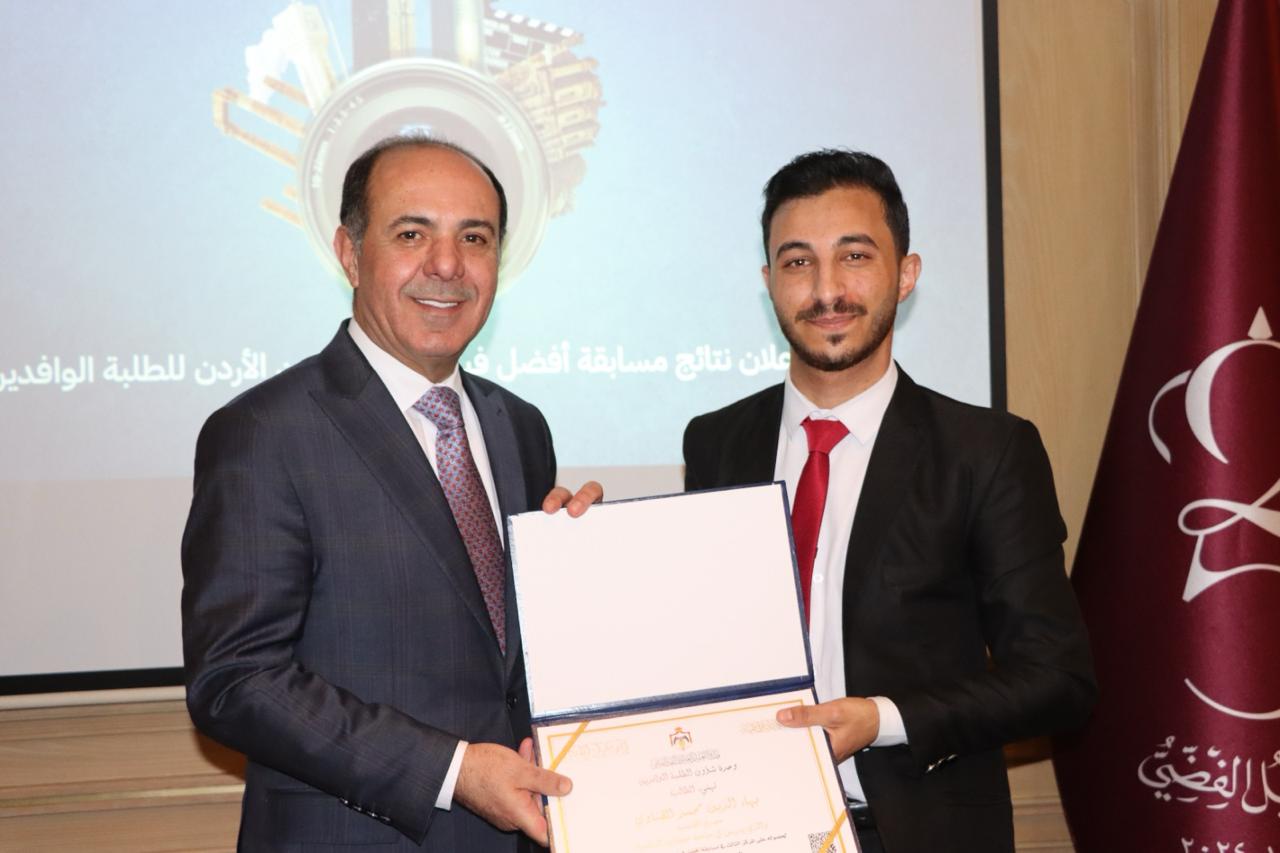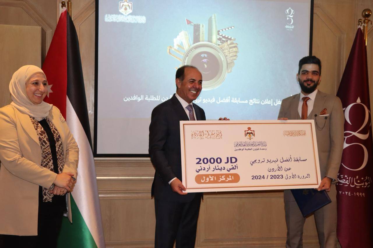 مندوباً عن وزير التعليم العالي والبحث العلمي الدكتور عزمي محافظة رعى أمين عام الوزارة الدكتور مأمون الدبعي اليوم الأربعاء وبحضور عدد من سفراء الدول والملحقين / المستشارين الثقافيين، إضافةً إلى عدد من رؤساء الجامعات الأردنية الحفل الختامي لمسابقة أفضل فيديو ترويجي عن الأردن للطلبة الوافدين الدارسين في مؤسسات التعليم العالي الأردنية، حيث تم الإعلان عن فوز ثلاثة طلاب بالمراكز الثلاثة الأولى وفقاً لما يلي: المركز الأول حصل عليه الطالب ناصر أحمد مسالمه (سوري الجنسية) ويدرس في جامعة فيلادلفيا، في حين حصلت على المركز الثاني الطالبة إسراء محمد رجب (بحرينية الجنسية) وتدرس في جامعة العلوم والتكنولوجيا الأردنية، وحصل على المركز الثالث الطالب بهاء الدين محمد القناوي (مصري الجنسية) ويدرس في جامعة عجلون الوطنية، وستقوم الوزارة بنشر هذه الفيديوهات الفائزة على موقعها الإلكتروني، إضافةً إلى جميع منصات التواصل الإجتماعي الخاصة بها.