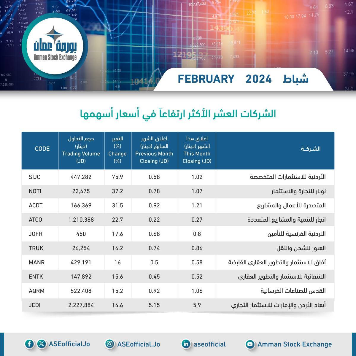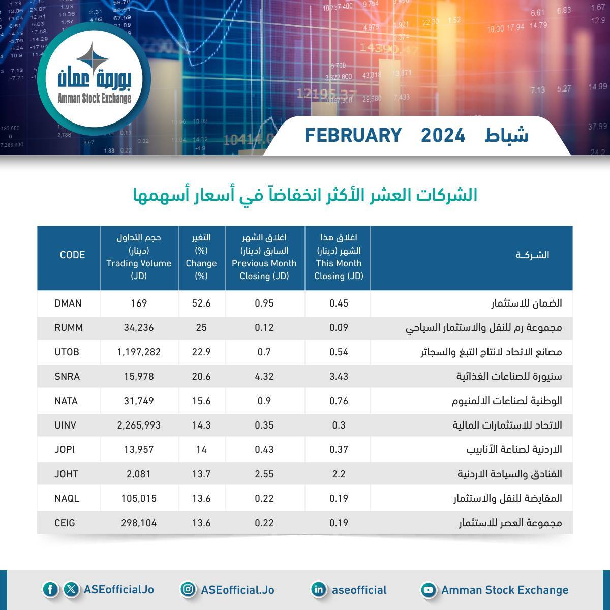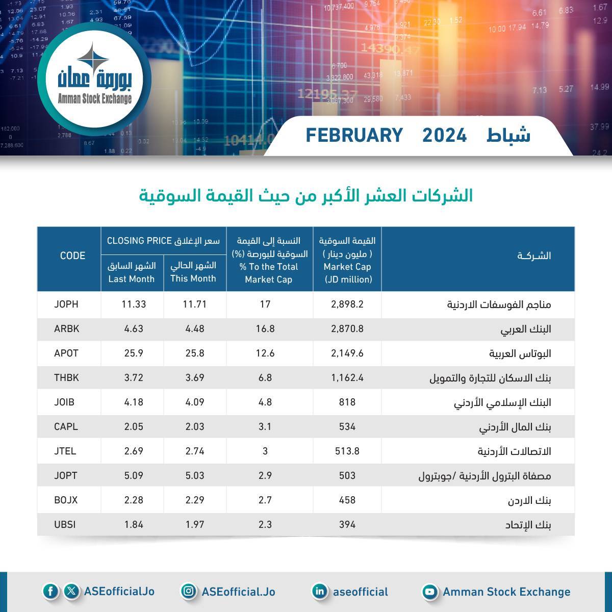 تاليا النشرة الإحصائية لشهر شباط 2024 لبورصة عمان: