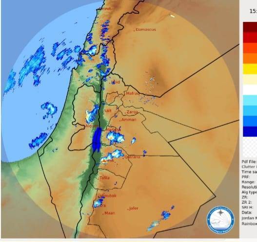 قالت دائرة الارصاد الجوية إن صور رادار الطقس رصدت هطول أمطار غزيرة على اجزاء من محافظتي مادبا، والكرك، والأجزاء الغربية من محافظة معان.