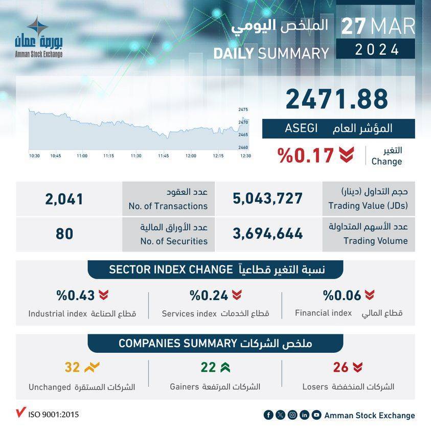 بلغ حجم التداول الإجمالي ليوم الأربعاء 27/03/2024 حوالي (5.0) مليون دينار وعدد الأسهم المتداولة (3.7) مليون سهم، نفذت من خلال (2,041) عقداً.