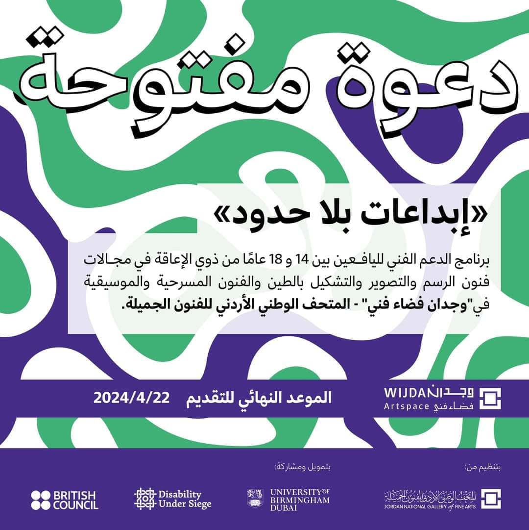 اعلن المتحف الوطني الأردني للفنون الجميلة عن الدعوة المفتوحة لليافعين من ذوي الإعاقة الذين تتراوح أعمارهم بين 14 و18 عاماً للمشاركة في برنامج «إبداعات بلا حدود» في "وجدان فضاء فني" - المتحف الوطني الأردني للفنون الجميلة.