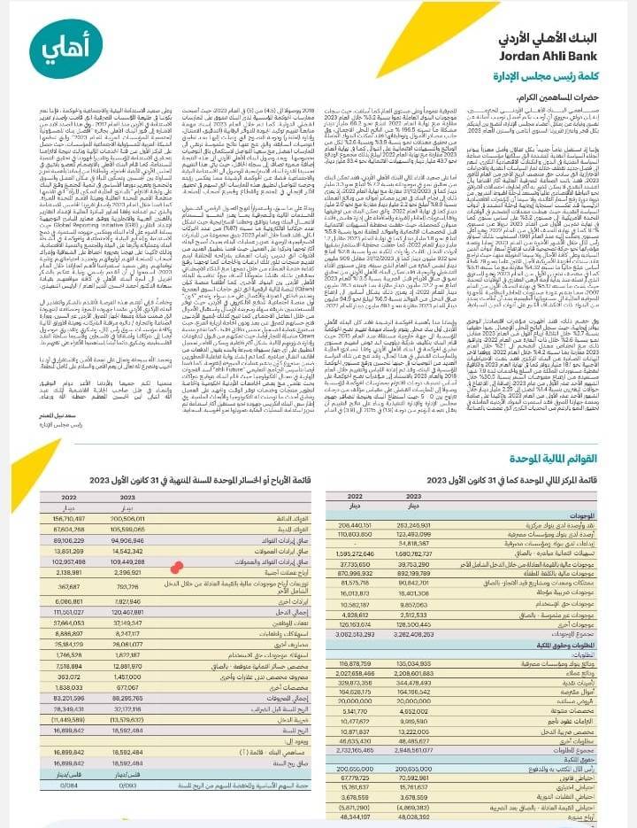 مســـ ـــ ــــاهمـي البـــ ـــ ـــنك الأهـــ ــــلـي الأردنـــ ـــ ـــي المحـترمـــ ـــ ـــ ــين، إنه لمن دواعي سروري أن أرحب بكم أجمل ترحيب أصالة عن نفسي ونيابة عن زملائي أعضاء مجلس الإدارة، لنضع بين أيديكم بكل فخر واعتزاز تقريرنا السنوي الثامن والستين للعام 2023.
