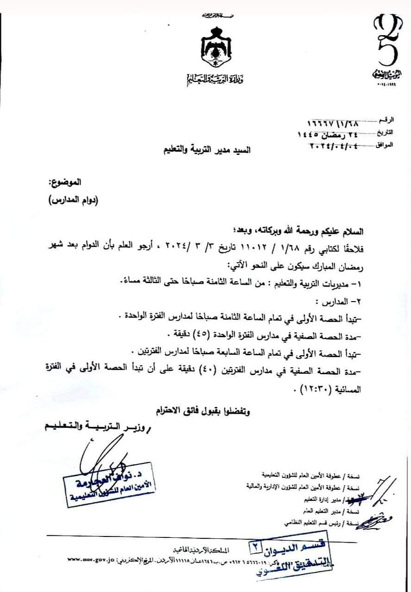 وبحسب التعميم الذي يحمل تاريخ أمس الخميس 4 نيسان، فقد وجه العجارمة أن يبدأ دوام مديريات التربية والتعليم من الساعة الثامنة صباحًا وحتى الساعة الثالثة مساءً على أن تبدأ الحصة الاولى في مدارس الفترة الواحدة الساعة الثامنة صباحًا أيضًا ولمدة 45 دقيقة.