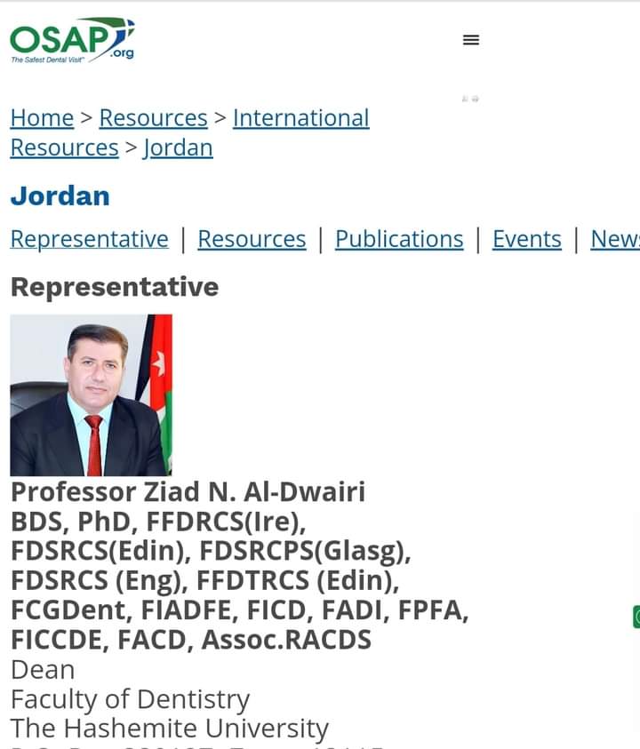 وليد حماد - شارك الاستاذ الدكتور زياد الدويري عميد كلية طب الأسنان في الجامعة الهاشمية - ضمن هيئة تحرير عالمية في الإصدارين الأول والثاني لعام 2024 من الدليل العالمي لضبط انتشار العدوى في طب الاسنان والصادر عن منظمة السلامة والوقاية من العدوى في طب الاسنان(OSAP) ومقرها الولايات المتحدة الأمريكية، وذلك ضمن فريق من المتخصصين العالميين في مجال مكافحة العدوى.