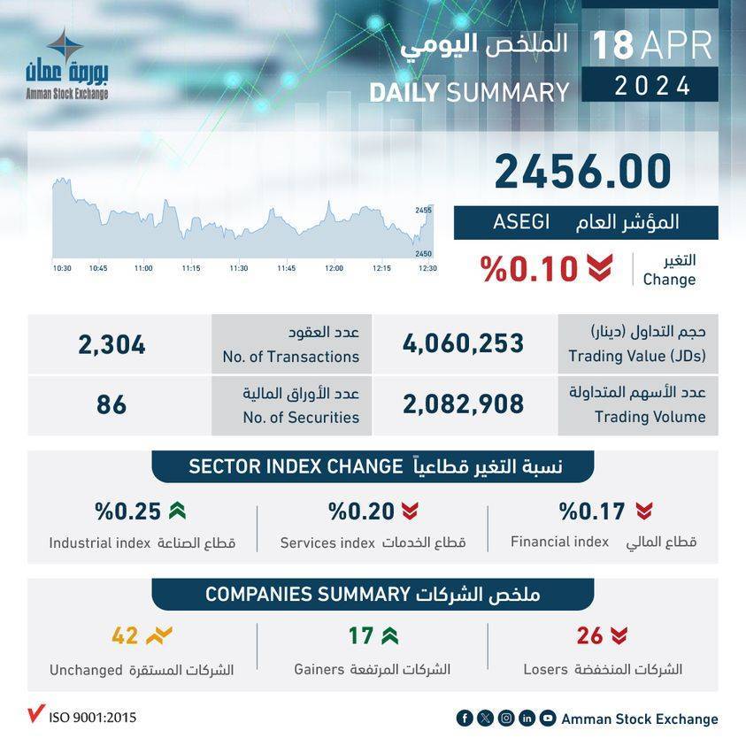 أما الشركات الخمس الأكثر انخفاضاً في أسعار أسهمها فهي الوطنية لصناعة الصلب بنسبة (4.63%), الآلبان الأردنية بنسبة (4.62%), الكفاءة للاستثمارات المالية والاقتصادية بنسبة (4.00%), انجاز للتنمية والمشاريع المتعددة بنسبة (3.85%), و الانتقائية للاستثمار والتطوير العقاري بنسبة (3.64%).
