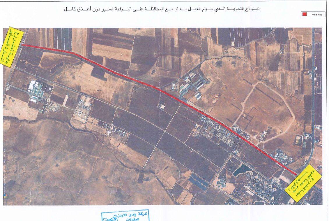 1- سيتم فصل الطريق المتجه من أشارة (سايبر ستي) بأتجاه الرمثا وحتى جسر جامعة العلوم والتكنولوجيا بواسطة حواجز بلاستيكية ومباشرة العمل في أحد المسارب والإبقاء على المسرب الآخر مفتوح لحركة المرور وذلك لكل منطقة عمل.