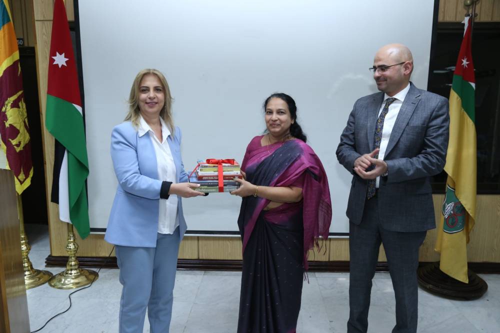 من جهتها، عبرت السفيرة في كلمتها عن سعادتها لقبول هذا الإهداء، ما يعكس التزام الجامعة بتوفير موارد تعليمية متنوعة، وتعزيز التبادل الثقافي والتميز الأكاديمي، كما يرمز إلى التعاون الودي بين سريلانكا والأردن، الأمر الذي يعزز التفاهم المتبادل ويقوي الروابط بين البلدين، معربةً عن أملها في مساهمة الكتب المهداة في تعميق فهم الشباب الأردنيين لجمهورية سريلانكا وثقافتها ولغتها وتاريخها، ومبديةً تطلعها إلى تعاون أوثق بين السفارة والجامعة مستقبلا.