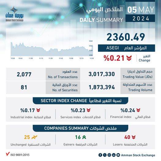 بلغ حجم التداول الإجمالي ليوم الأحد 05/05/2024 حوالي (3.0) مليون دينار وعدد الأسهم المتداولة (1.9) مليون سهم، نفذت من خلال (2,077) عقداً.