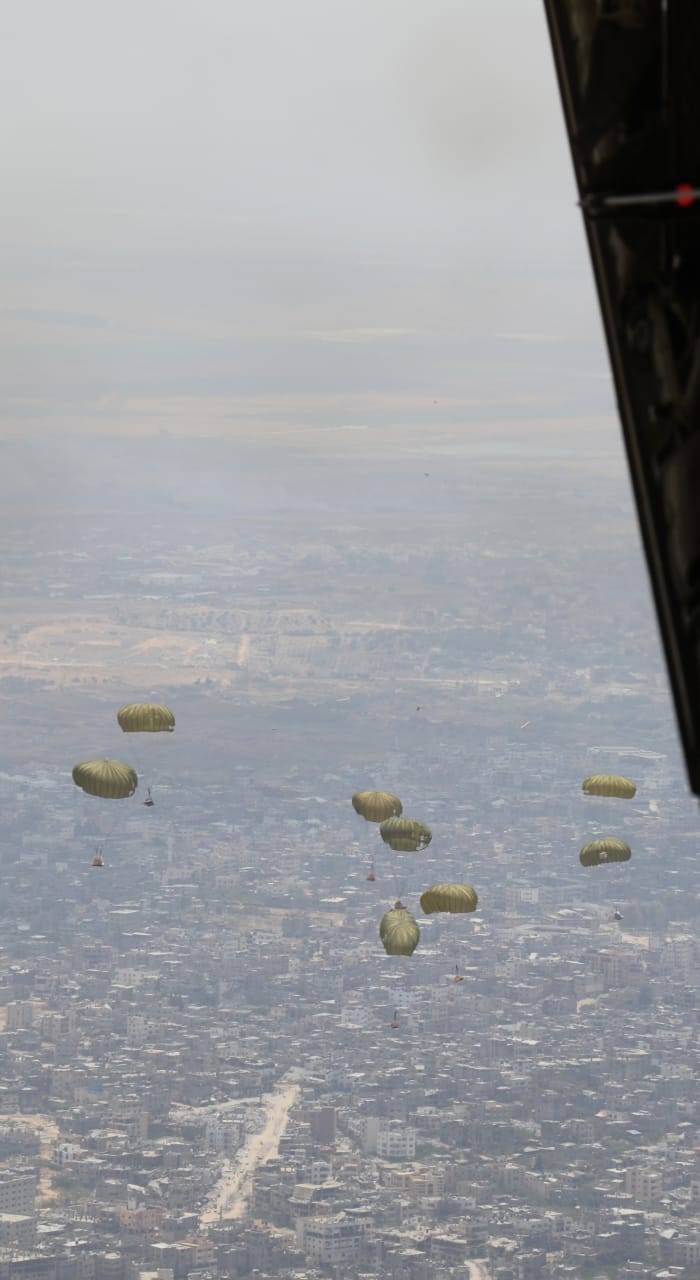واشتملت الإنزالات الجوية على مساعدات إغاثية وإنسانية لمساندة الأهل في قطاع غزة، جراء الحرب الإسرائيلية المستمرة على القطاع.