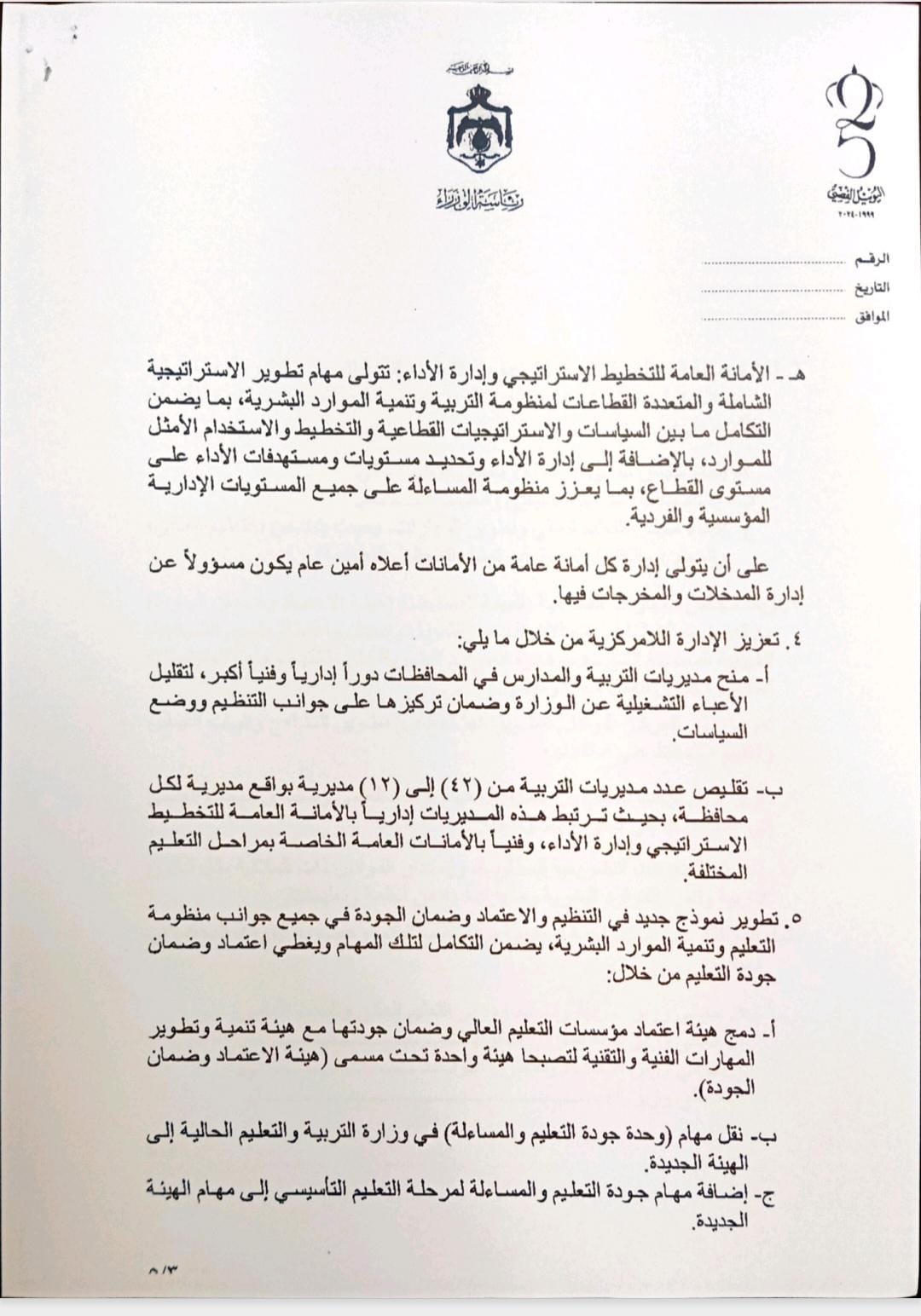 وصلت وثيقة الى موقع نبأ الاردن الاخباري تؤكد بأن الاردن سيكون قريبا بلا وزارتي تربية وتعليم، وتعليم عالي وبحث علمي، وبقرار من الحكومة.