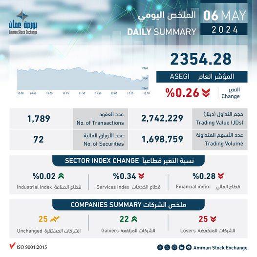 بلغ حجم التداول الإجمالي ليوم الاثنين 06/05/2024 حوالي (2.7) مليون دينار وعدد الأسهم المتداولة (1.7) مليون سهم، نفذت من خلال (1,789) عقداً.