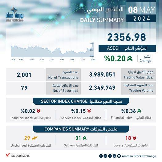 بلغ حجم التداول الإجمالي ليوم الأربعاء 08/05/2024 حوالي (4.0) مليون دينار وعدد الأسهم المتداولة (2.3) مليون سهم، نفذت من خلال (2,001) عقداً.
