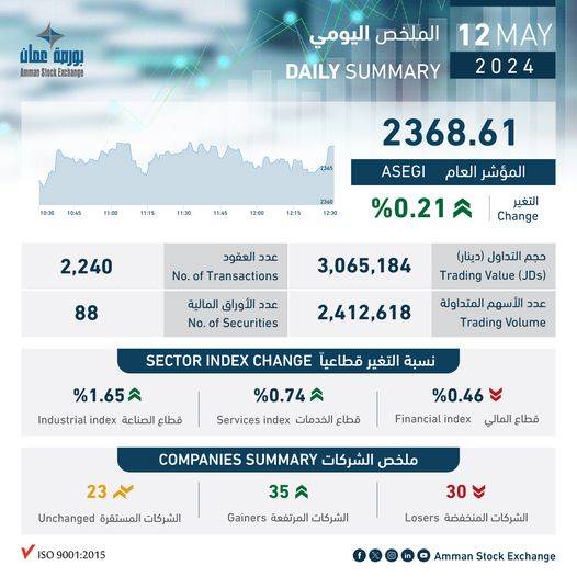 بلغ حجم التداول الإجمالي ليوم الأحد 12/05/2024 حوالي (3.1) مليون دينار وعدد الأسهم المتداولة (2.4) مليون سهم، نفذت من خلال (2,240) عقداً.