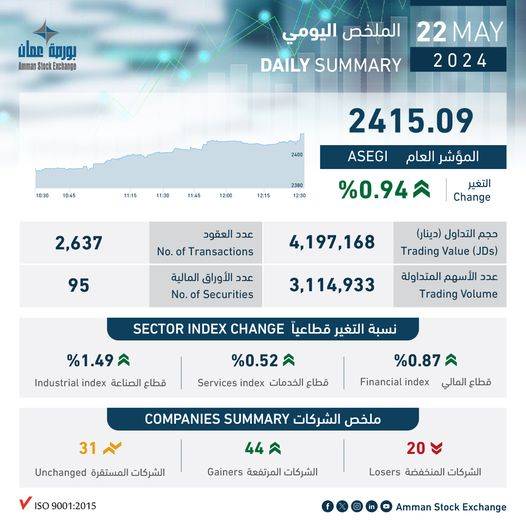 بلغ حجم التداول الإجمالي ليوم الأربعاء 22/05/2024 حوالي (4.2) مليون دينار وعدد الأسهم المتداولة (3.1) مليون سهم، نفذت من خلال (2,637) عقداً.