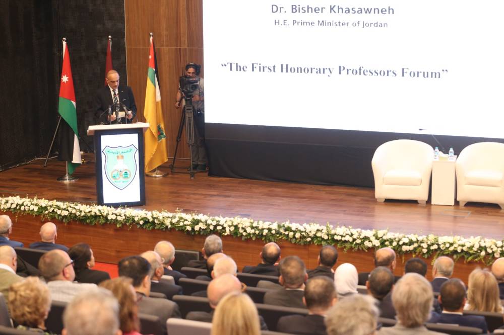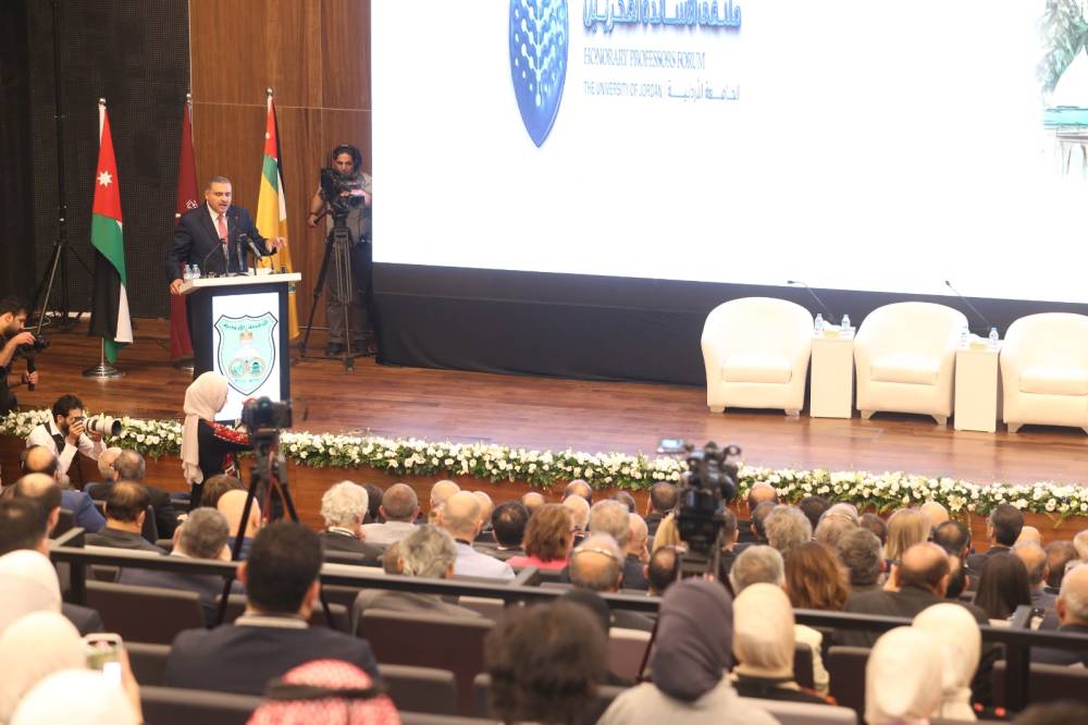 وقدَّم الخصاونة التحيَّة للأساتذة الفخريين الذين تستضيفهم الجامعة في هذا الملتقى المهم؛ والذين تمَّ اختيارهم "ليكونوا عوناً وسنداً للجامعة، ويمنحوها الحكمة والقوَّة والنَّصيحة، فتبني الجامعة الأردنيَّة بهم مدماكاً جديداً في بنائها الرَّاسخ وتثبت عالميَّتَها وقوَّتها، كما أرادها الهاشميُّون بنياناً قويَّاً، يُشكِّلُ صورةً ناصِعةً من نسيج هذا الوطن".
