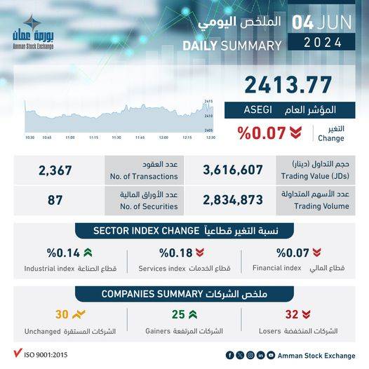 بلغ حجم التداول الإجمالي ليوم الثلاثاء 04/06/2024 حوالي (3.6) مليون دينار وعدد الأسهم المتداولة (2.8) مليون سهم، نفذت من خلال (2,367) عقداً.