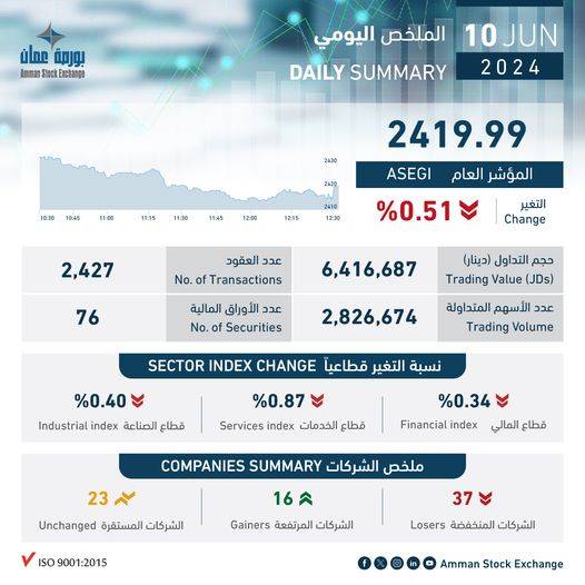 بلغ حجم التداول الإجمالي ليوم الاثنين 10/06/2024 حوالي (6.4) مليون دينار وعدد الأسهم المتداولة (2.8) مليون سهم، نفذت من خلال (2,427) عقداً.