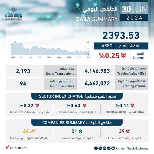 بلغ حجم التداول الإجمالي ليوم الأحد 30/06/2024 حوالي (4.1) مليون دينار وعدد الأسهم المتداولة (4.5) مليون سهم، نفذت من خلال (2,193) عقداً.