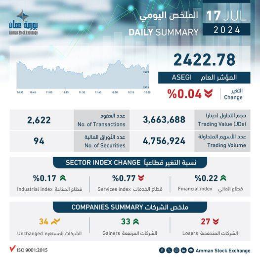 بلغ حجم التداول الإجمالي ليوم الأربعاء 17/07/2024 حوالي (3.7) مليون دينار وعدد الأسهم المتداولة (4.8) مليون سهم، نفذت من خلال (2,622) عقداً.
