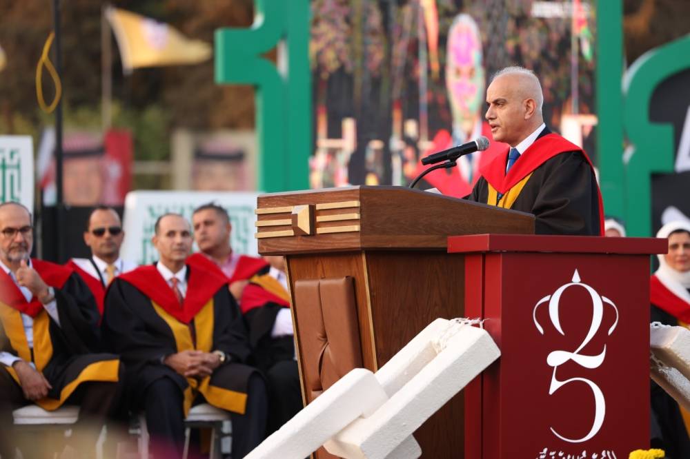 وخاطب الطلبة قائلا "اجتزتم متطلبات الدرجات العلمية وعشتم تجربةً وحياةً جامعيةً فريدةً من خلال ما وفّرته لكم "الأردنية"؛ الجامعة العالمية الرائدة في بيئتها ومختبراتها ومرافقها وفعالياتها العلمية والثقافية من برامج صقلت ذواتكم وعمقت مدارككم وهيأتكم للعمل والحياة بكل جدارة واستحقاق، كما اجتزتم متطلبات الدرجات العلمية التي طالما حلمتم بها، وبكلّ تأكيد كانت فترة دراستكم غنيةً بالتجارب والتحديات والفرص وتعلمتم مواجهة العقبات واكتسبتم الصداقات، وطورتم مهاراتكم التخصصية والحياتية وأتقنتم التواصل الحضاري الإنساني مع أقرانكم وأبناء مجتمعاتكم، يدفعكم الأمل والطموح والسعي الدؤوب للتميز والرغبة في إثبات ذواتكم وخدمة وطنكم، كلّ ذلك بفضل الأردنية التي نشأت لتكون حاملةً وحاضنةً للواء بناء الإنسان المسلح بالعلم والمعرفة والفضيلة والانتماء لوطنه وأمته وقيادته والإنسانية".