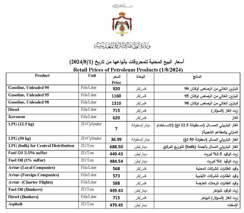 تالياً أسعار البيع المحلية للمحروقات بأنواعها اعتباراً من تاريخ 1-8-2024 :