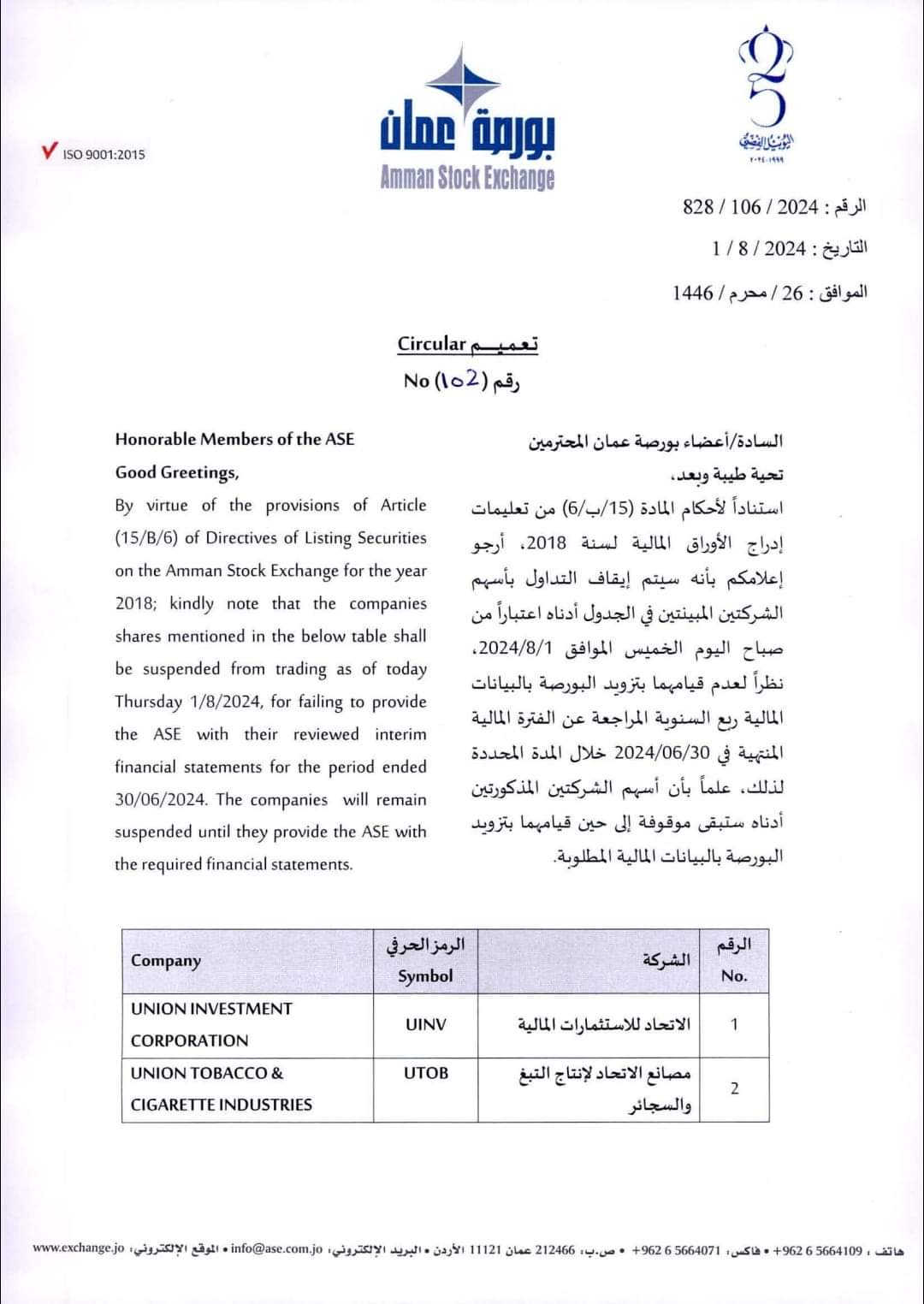 وقالت أن سبب ذلك يعود لعدم قيام الشركتين بتزويد البورصة بالبيانات المالية ربع السنوية المراجعة من الفترة المالية المنتهية ٢٠٢٤/٦/٣٠ خلال المدة المحدودة لذلك، علما بأن أسهم الشركتين المذكورتين ستبقى موقوفة إلى حين قيامهما بتزويد البورصة بالبيانات المطلوبة.