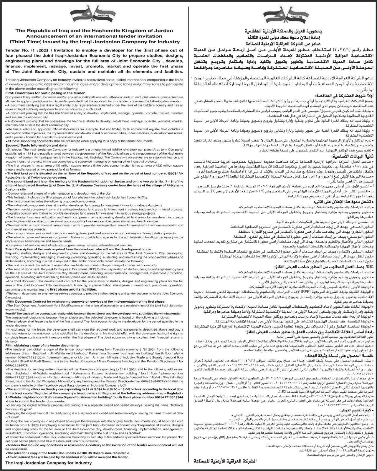 أعلنت الشركة العراقية الأردنية للصناعة، إعادة طرح عطاء دولي للمرة الثالثة، لاستقطاب مطور للمرحلة الأولى من أصل 4 مراحل من المدينة الاقتصادية العراقية الأردنية المشتركة.