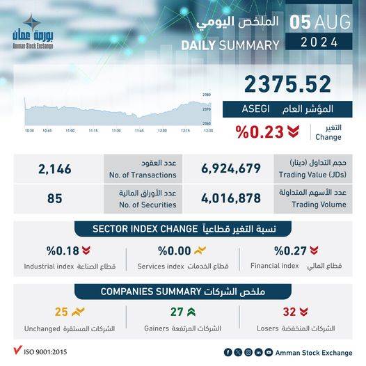 وفي مقارنة أسعار الإغلاق للشركات المتداولة أسهمها، تبين أن 27 شركة أظهرت ارتفاعا في أسعار أسهمها، بينما انخفضت أسعار 32 شركة، واستقرت أسهم 25 شركة أخرى.