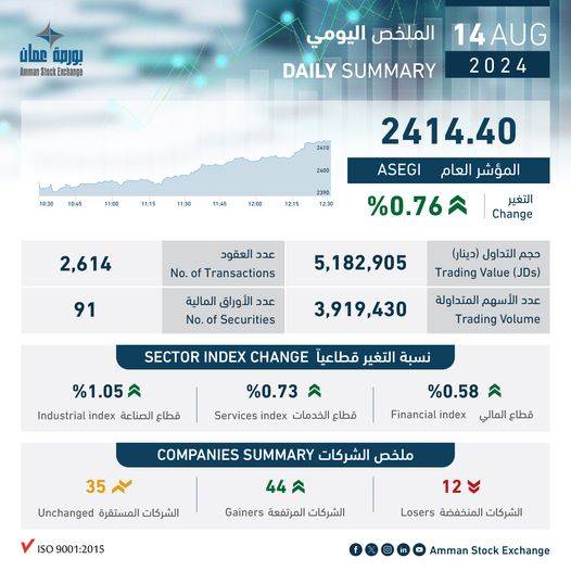 بلغ حجم التداول الإجمالي ليوم الأربعاء 14/08/2024 حوالي (5.2) مليون دينار وعدد الأسهم المتداولة (3.9) مليون سهم، نفذت من خلال (2,614) عقداً.