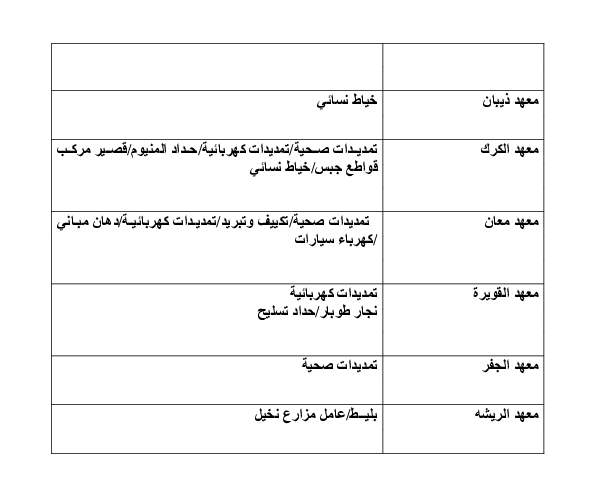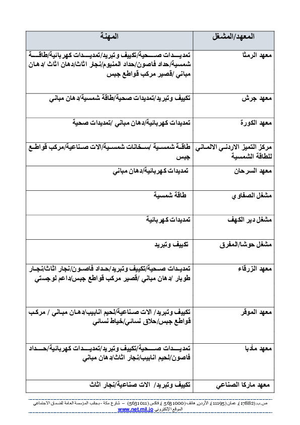 أعلنت الشركة الوطنية للتشغيل والتدريب – القوات المسلحة الأردنية، عن فتح باب التسجيل في معاهدها المنتشرة في جميع محافظات المملكة.