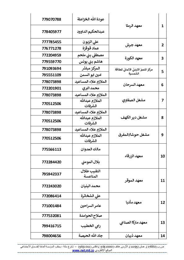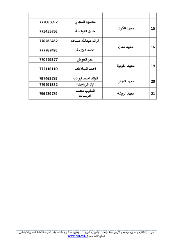 وللمزيد من المعلومات أو الاستفسار يرجى الاتصال على هاتف الشركة (5631000)، أو من خلال خدمة واتساب على الرقم (0775441900)، أو عن طريق البريد الإلكتروني (info@net.mil.jo)، أو الاتصال على هواتف المعاهد المذكورة في أقاليم المملكة والمبينة في الكشف المرفق.