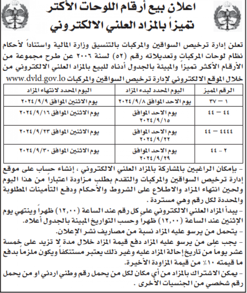 أعلنت إدارة ترخيص السواقين والمركبات اليوم الأربعاء وبالتنسيق مع وزارة المالية واستنادا إلى أحكام نظام لوحات المركبات وتعديلاته رقم 52 لسنة 2006 ، عن طرح مجموعة من الأرقام الأكثر تميزا والمبينة في الجدول أدناه للبيع بالمزاد العلني الإلكتروني من خلال الموقع الإلكتروني لإدارة ترخيص السواقين والمركبات.