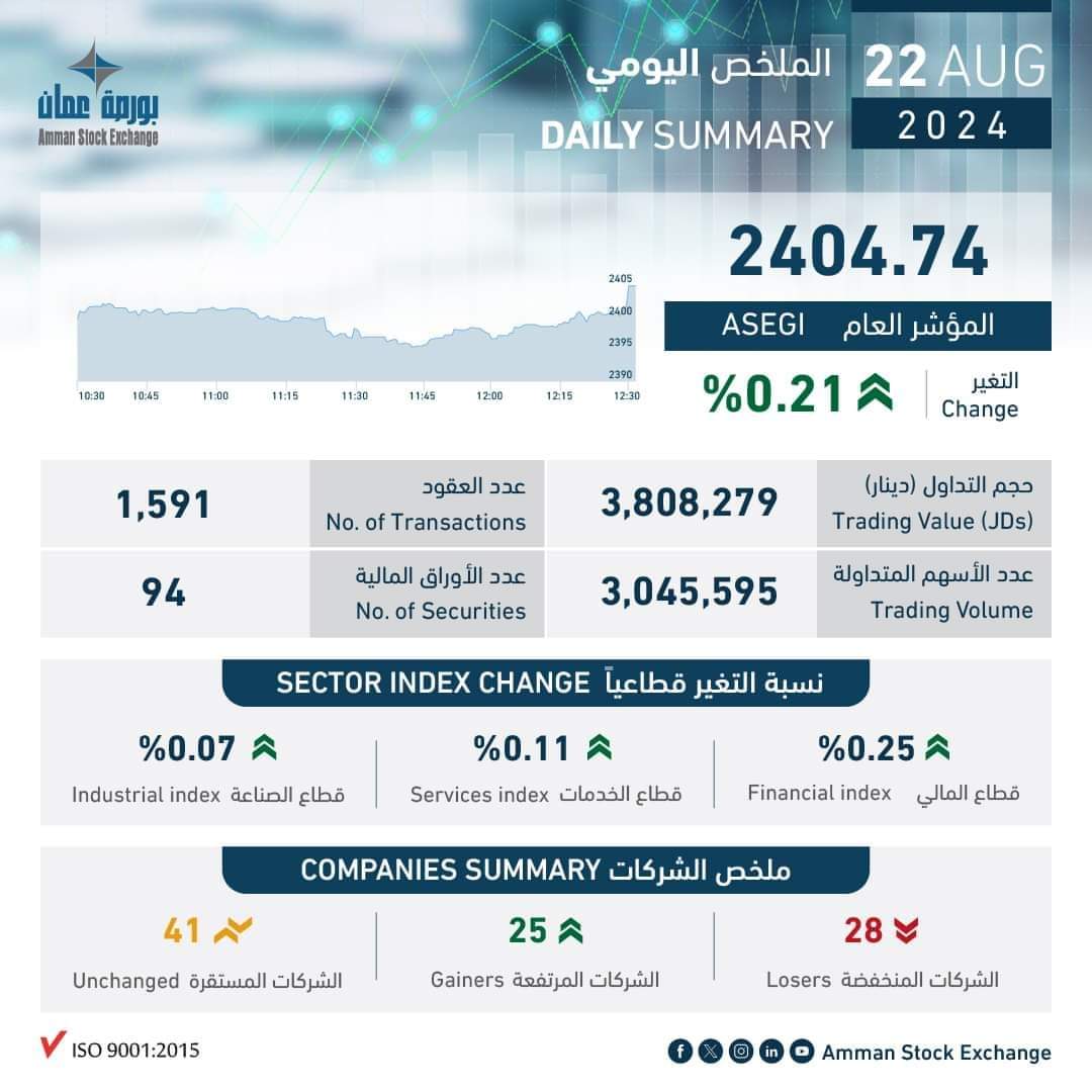 بلغ حجم التداول الإجمالي ليوم الخميس 22/08/2024 حوالي (3.8) مليون دينار وعدد الأسهم المتداولة (3.0) مليون سهم، نفذت من خلال (1,591) عقداً.