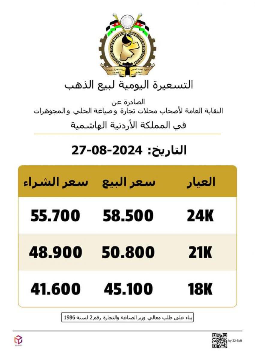 وبلغ سعر بيع غرام الذهب عيار 21 الاكثر طلبا لدى المواطنين 50.80 دينارا لغايات الشراء من محال الصاغة، مقابل 48.90 دينارا لجهة البيع.