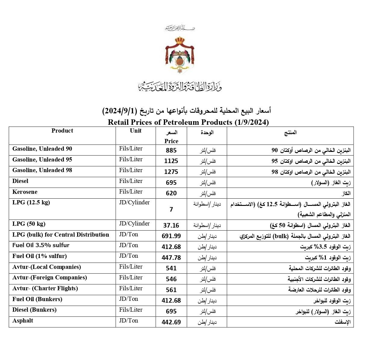 أسعار البيع المحلية للمحروقات بأنواعها إعتباراً من 2024/9/1