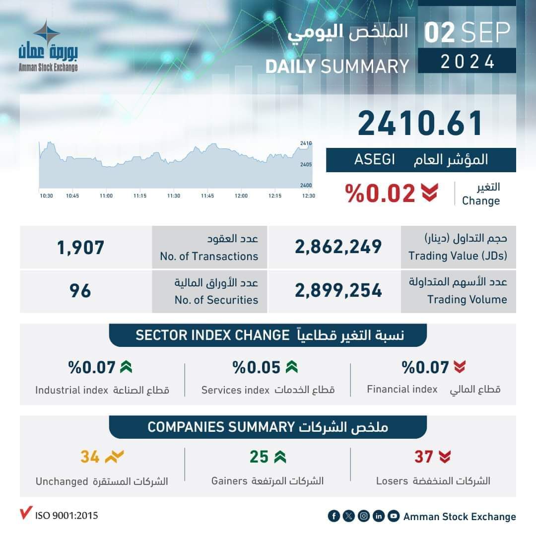بلغ حجم التداول الإجمالي ليوم الاثنين 02/09/2024 حوالي (2.9) مليون دينار وعدد الأسهم المتداولة (2.9) مليون سهم، نفذت من خلال (1,907) عقداً.
